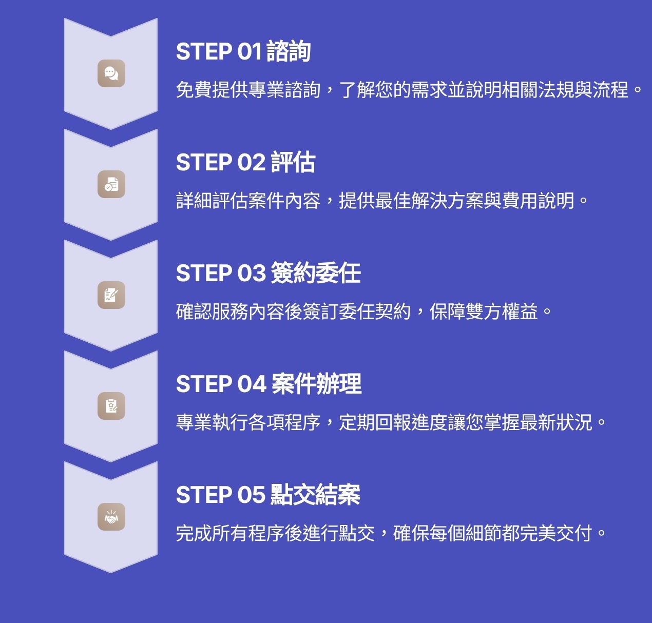 我們的服務流程清楚透明,讓您了解每個階段的進度,安心委託專業處理。